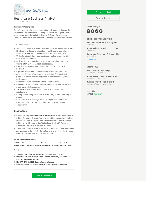 Healthcare Business Analyst Job At Sonsoft In Hartford Ct 9977467 Tapwage Job Search